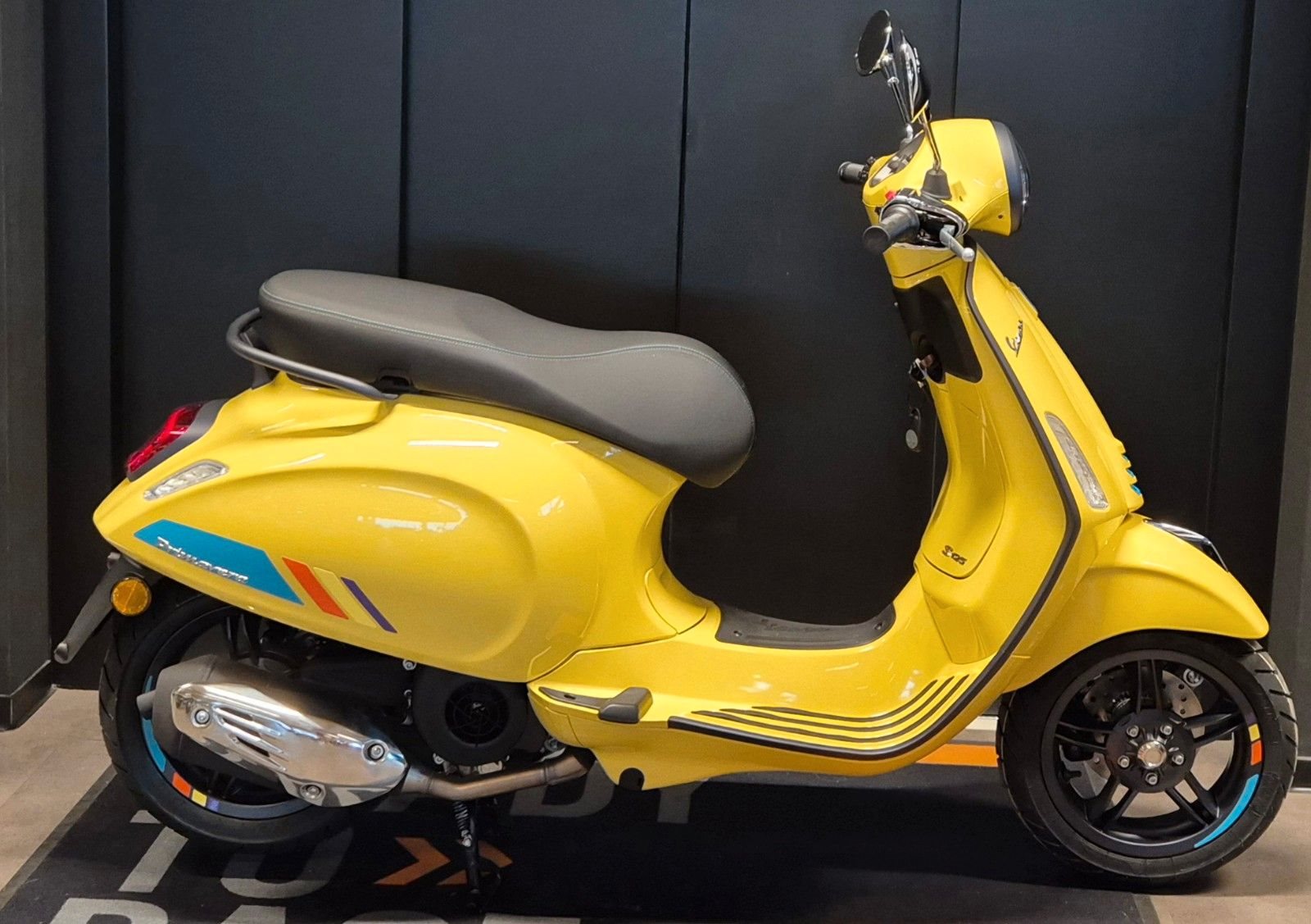 Kultiviert und modernDie Vespa Primavera S bietet die schlichte Eleganz einer italienischen Ikone, aber mit einer modernen, sportlichen Note. Chromdetails und graphitgraue Konturen setzen die Formen in Szene, während eine lebhafte Farbpalette, die sie in der Menge unübersehbar macht, den letzten Schliff verleiht.