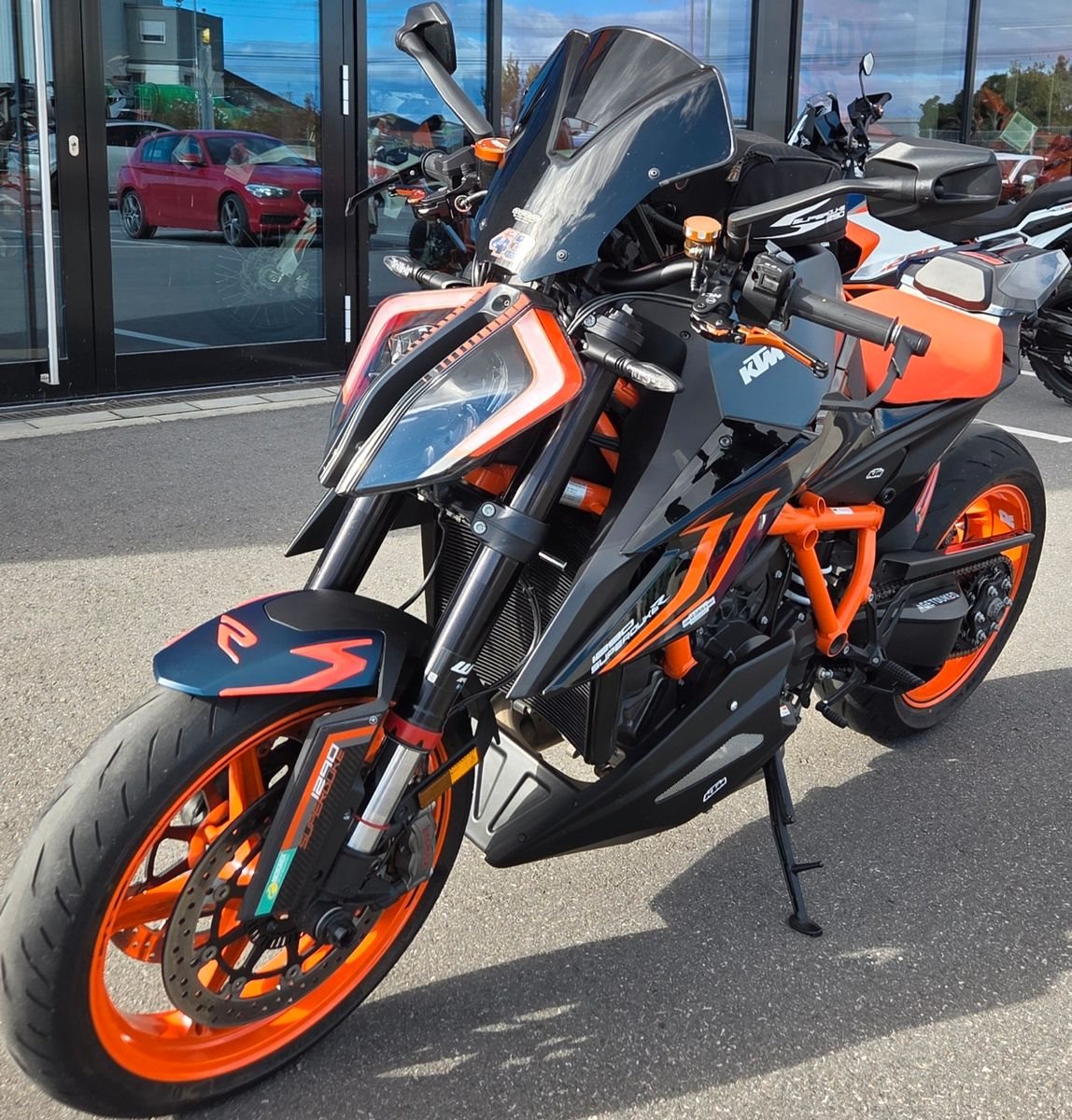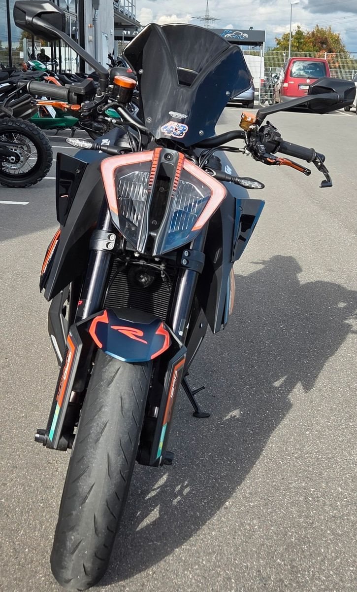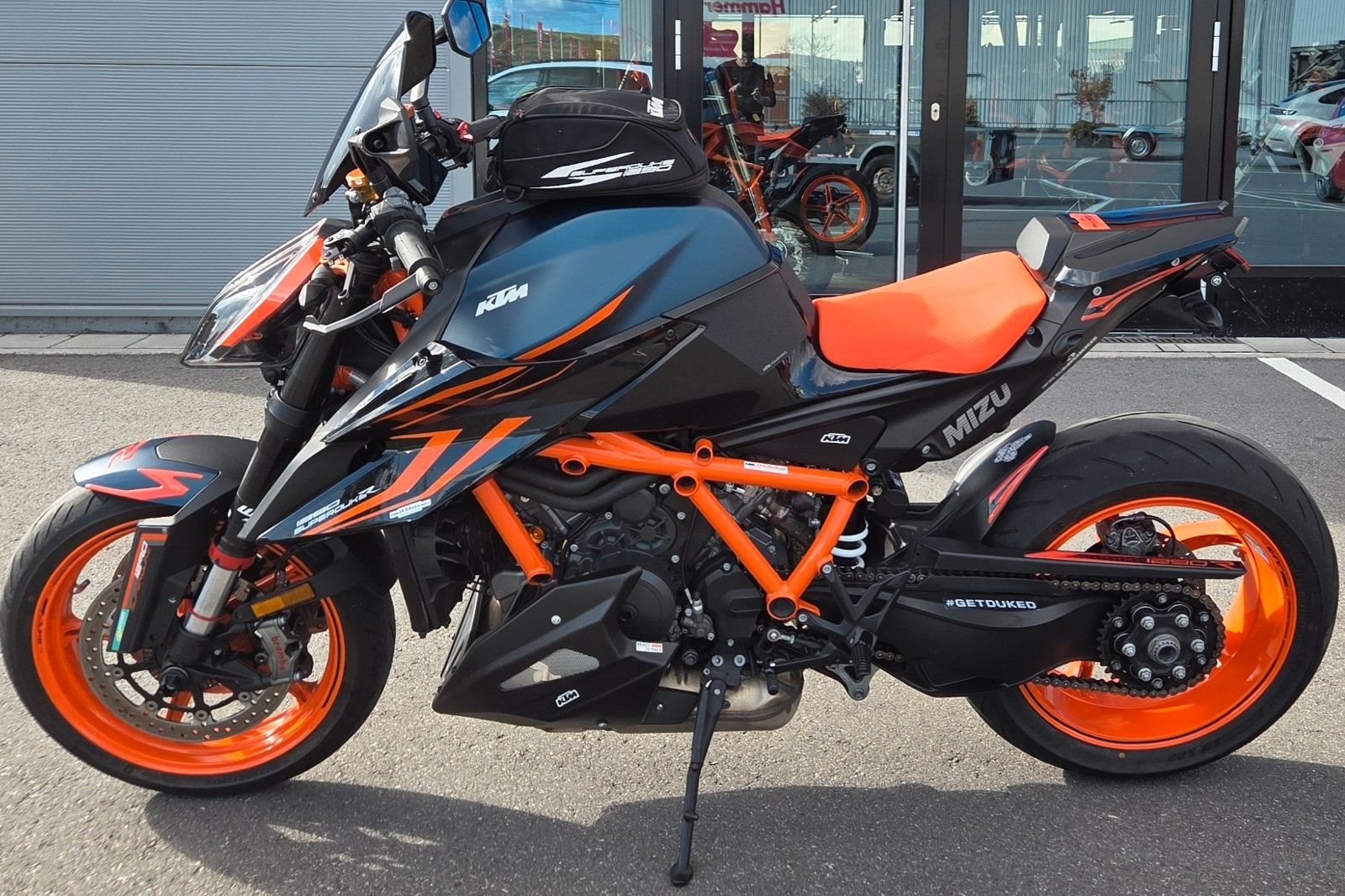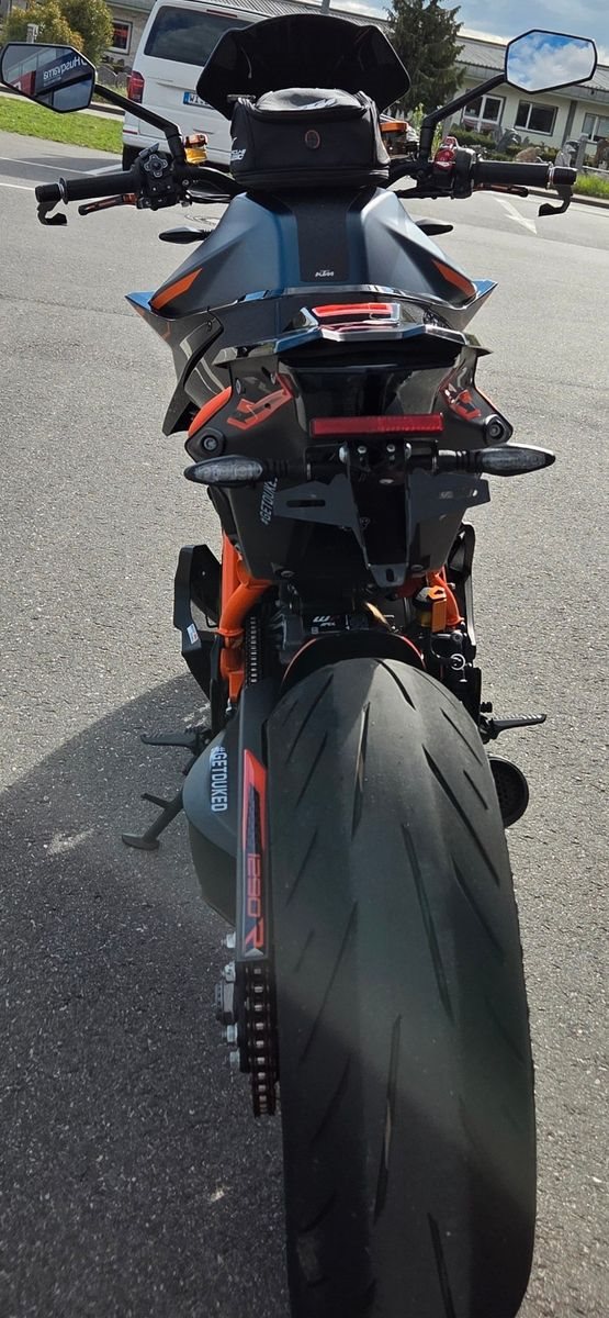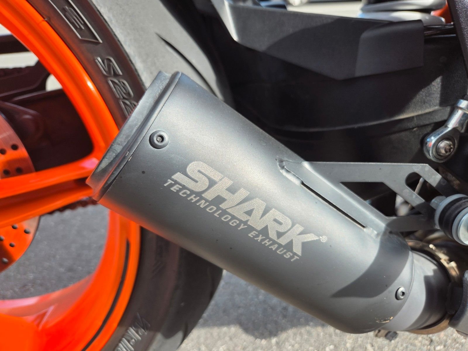 Tech Pack, Shark Auspuff, kurzer Kennzeichenhalter, Windschild, Bugspoiler, Motordeckelschützer, Brems-/Kupplungshebelschützer, verstellbare Brems-/Kupplungshebel, eleoxierte Flüssigkeitsbehälterdeckel, Soziusabdeckung, Tankrucksack, Sitzbezug orange, Tankschutzfolie, Achspads vorne