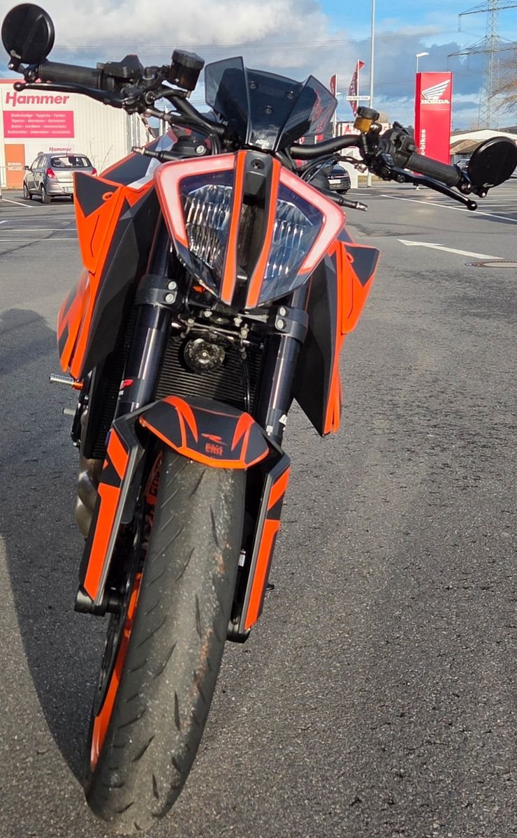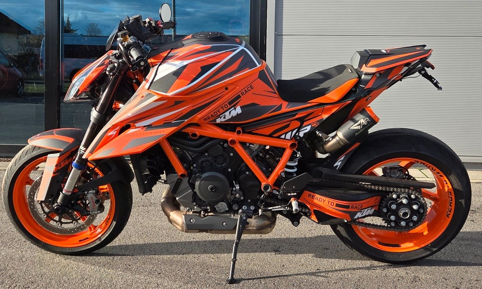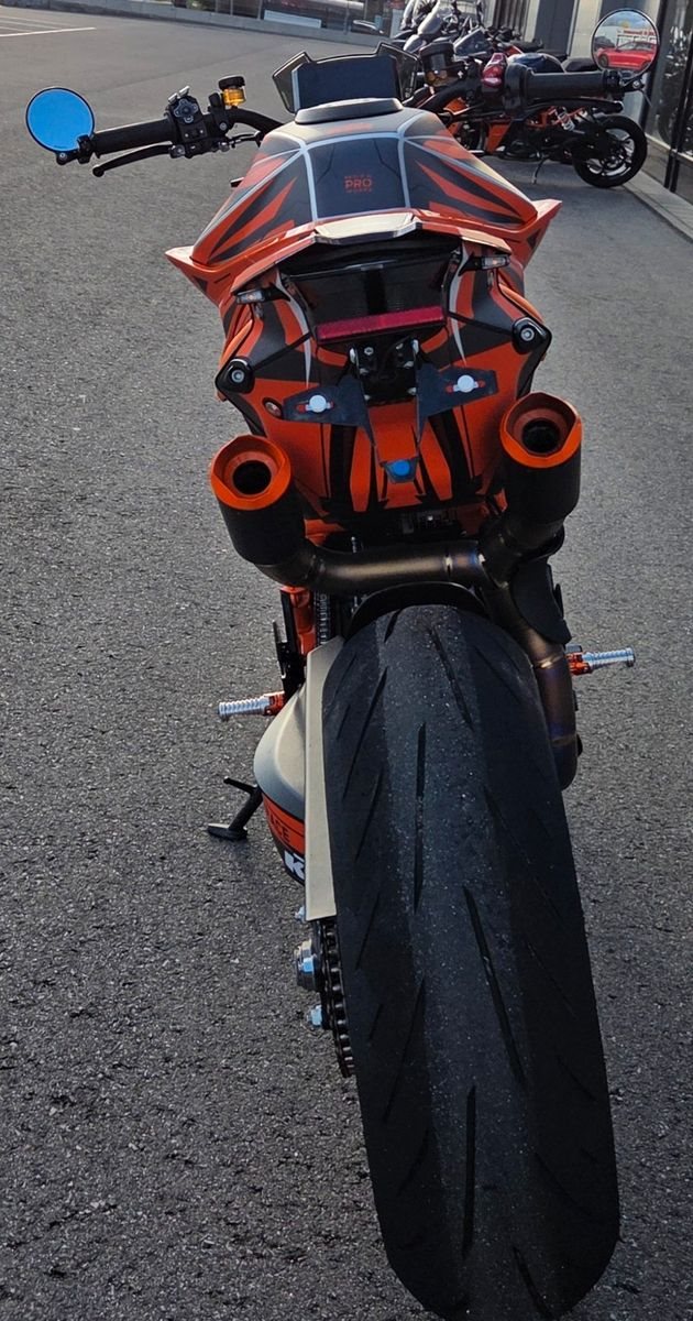 Austin Racing Auspuffanlage, Techpack, Factory Fußrastenanlage, Flyscreen, Tempomat, Motoproworks Dekorkit, Kurzer Kennzeichenhalter, KTM Mini Blinker vo./hi., Soziusabdeckung, Klarer Kupplungsdeckel, Lenkerendenspiegel, Powerpartssitz, Felgenaufkleber