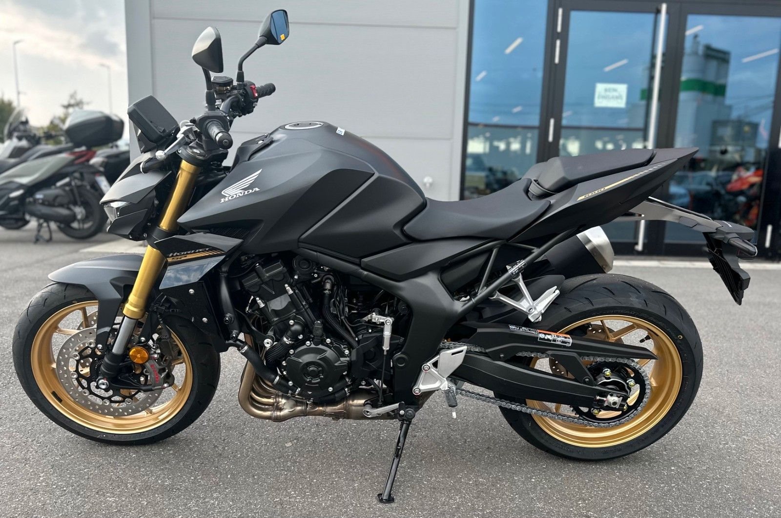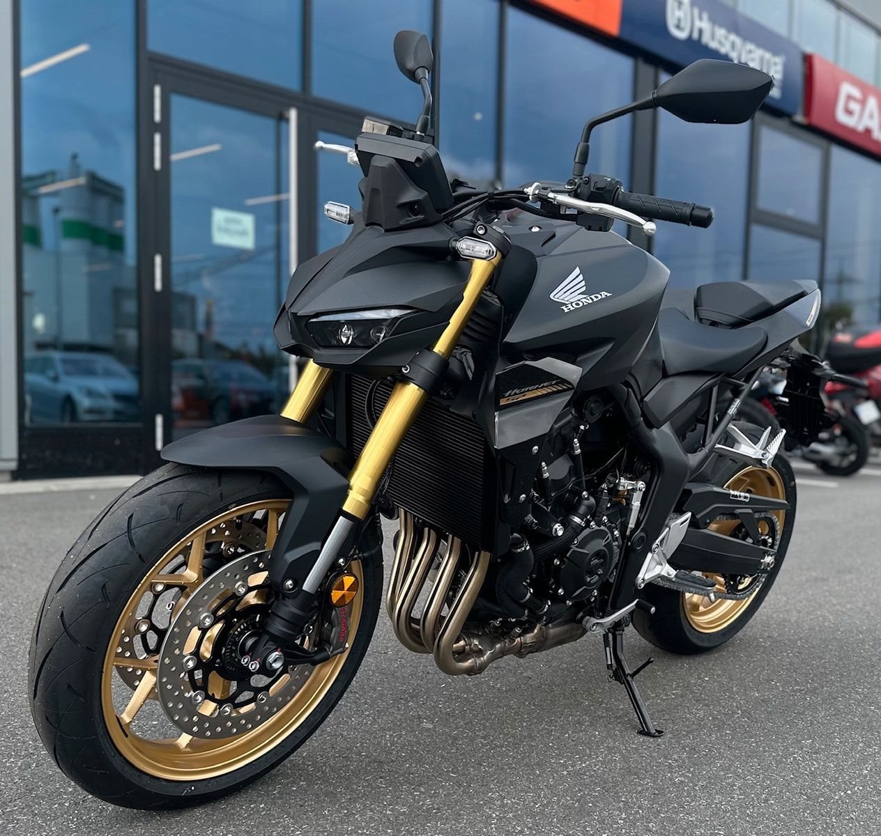 Die Hornet-Familie ist jetzt vollständig und unser Topmodell sticht heraus. Die neue CB1000 Hornet mit ihrem Vierzylindermotor ist ein erstklassiges Naked Bike, das den Asphalt zum Glühen bringt. Throttle By Wire sorgt für präzise Kontrolle, während das Fahrwerk mit der einstellbaren SHOWA 41mm SFF-BP Upside-Down-Gabel und dem Pro-Link-Federbein ausgestattet ist. Die unverfälschte, aggressive Streetfighter-Attitüde wird durch einen markanten LED-Doppelscheinwerfer unterstrichen. Das 5-Zoll TFT-Farbdisplay und die Honda RoadSync-Konnektivität sorgen für die nötigen Informationen. Kann es losgehen?